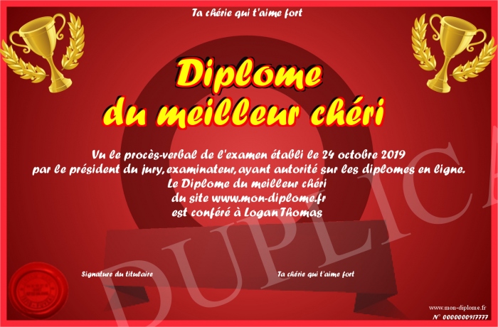 Envoyez par email votre Diplome du meilleur chéri personalisé