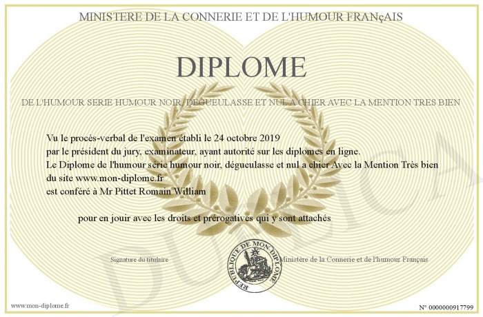 Envoyez par email votre Diplôme de l'humour série humour noir, dégueulasse et nul a chier Avec la Mention Très bien personalisé