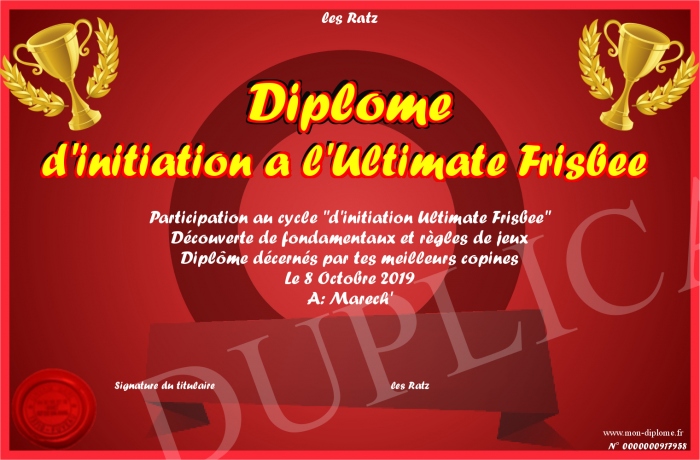 Envoyez par email votre Diplôme d'initiation a l'Ultimate Frisbee personalisé