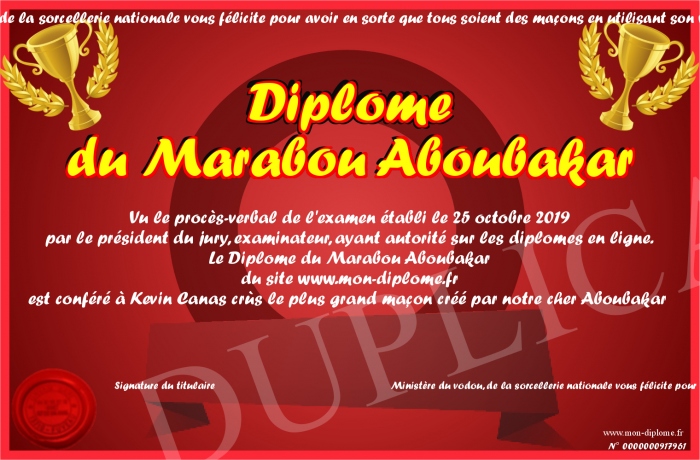 Envoyez par email votre Diplôme du Marabou Aboubakar personalisé