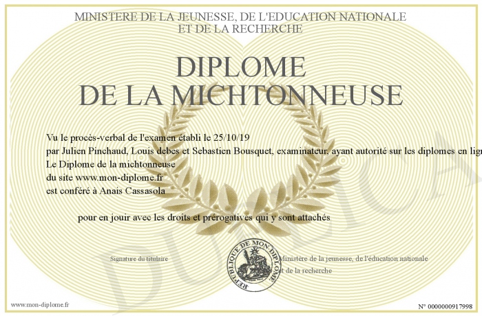 Envoyez par email votre Diplôme de la michtonneuse personalisé