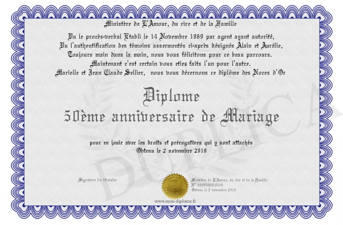 Envoyez par email votre Diplôme 50ème anniversaire de Mariage personalisé
