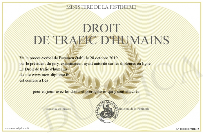 Envoyez par email votre Droit de trafic d'humains personalisé