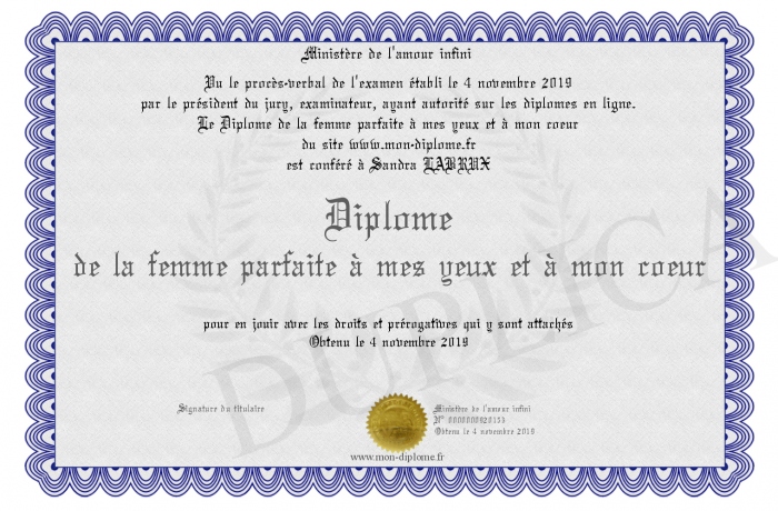 Envoyez par email votre Diplôme de la femme parfaite à mes yeux et à mon coeur personalisé