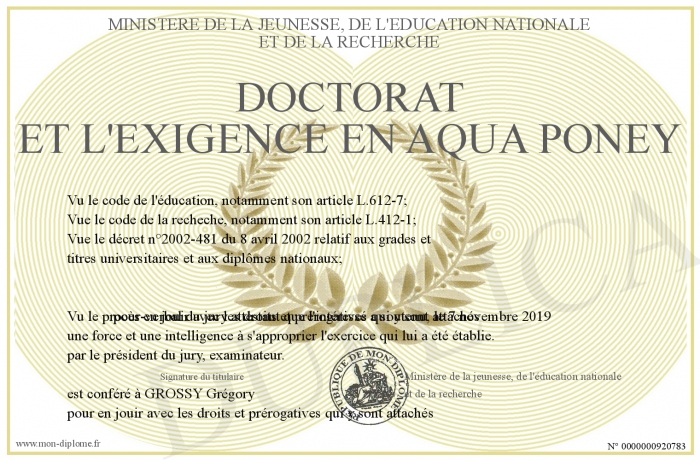 Envoyez par email votre DOCTORAT ET L'EXIGENCE en aqua poney personalisé