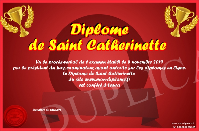 Envoyez par email votre Diplôme de Saint Catherinette personalisé