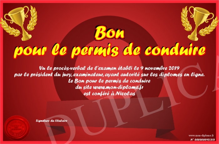 Envoyez par email votre Bon pour le permis de conduire personalisé