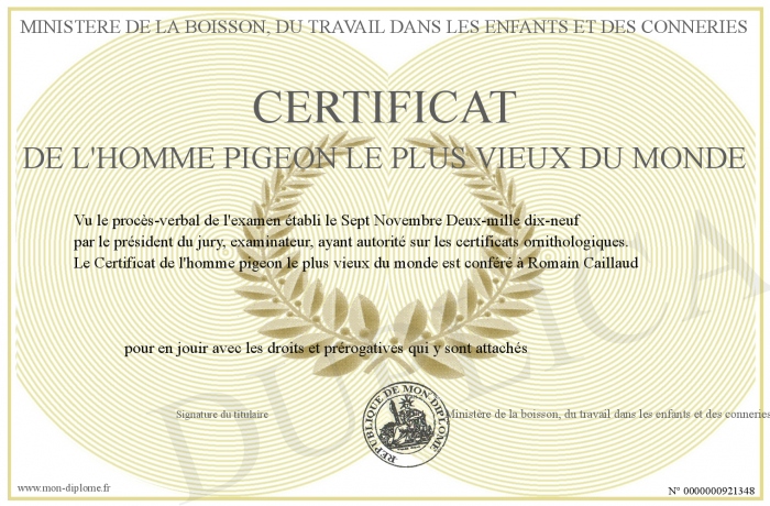 Envoyez par email votre Certificat de l'homme pigeon le plus vieux du monde personalisé