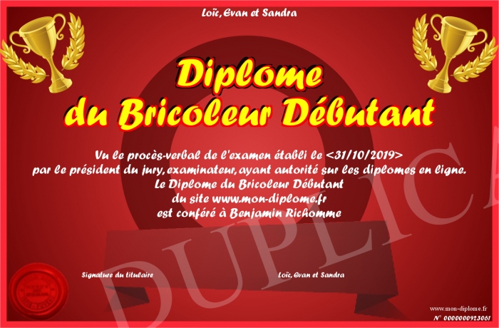 Envoyez par email votre Diplôme du Bricoleur Débutant personalisé