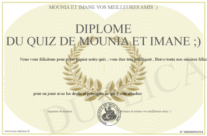 Envoyez par email votre Diplôme du quiz de mounia et imane ;) personalisé