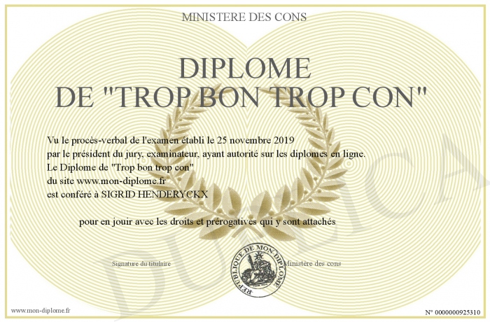 Envoyez par email votre Diplôme de -Trop bon trop con- personalisé