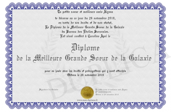 Envoyez par email votre Diplôme de la Meilleure Grande Soeur de la Galaxie personalisé