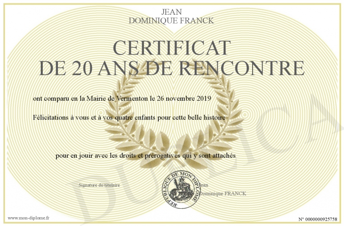 Envoyez par email votre Certificat de 20 ans de rencontre personalisé