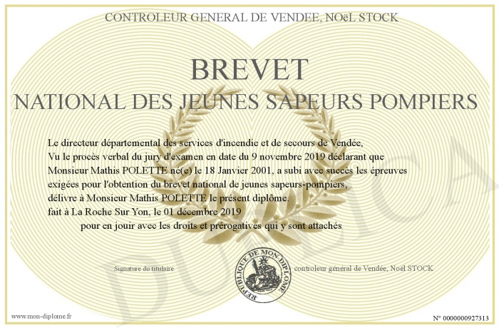 Envoyez par email votre Brevet national des jeunes sapeurs pompiers personalisé