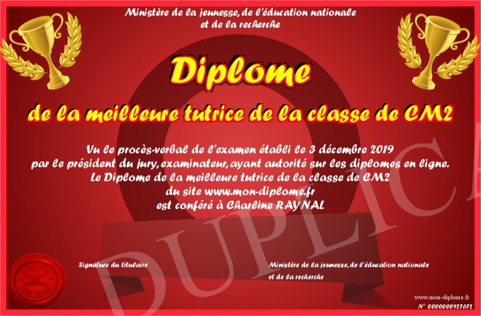Envoyez par email votre Diplôme de la meilleure tutrice de la classe de CM2 personalisé