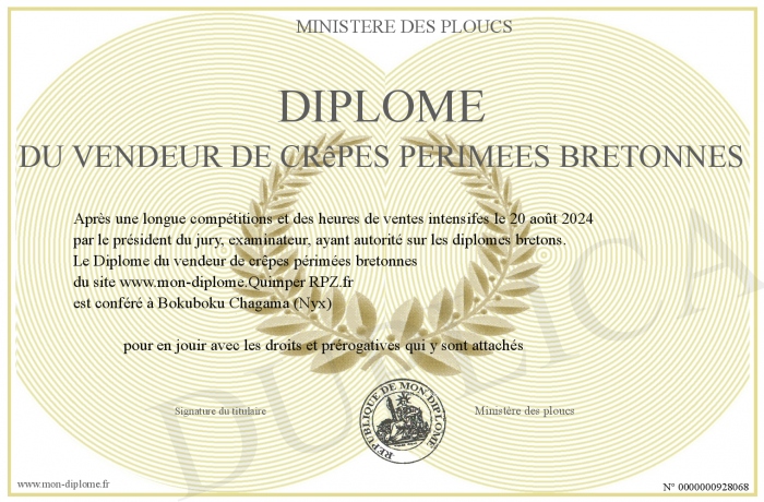 Envoyez par email votre Diplôme du vendeur de crêpes périmées bretonnes personalisé