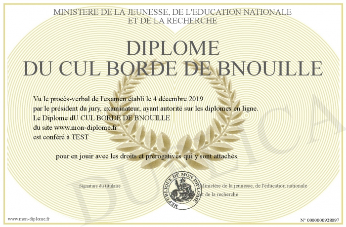 Envoyez par email votre Diplôme dU CUL BORDE DE BNOUILLE personalisé