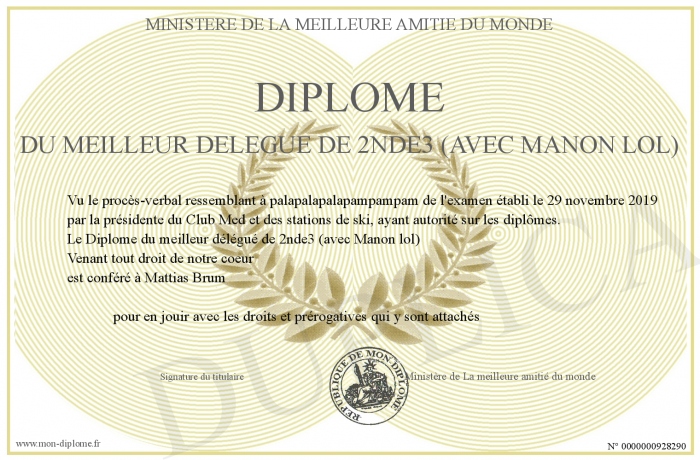 Envoyez par email votre Diplôme du meilleur délégué de 2nde3 (avec Manon lol) personalisé