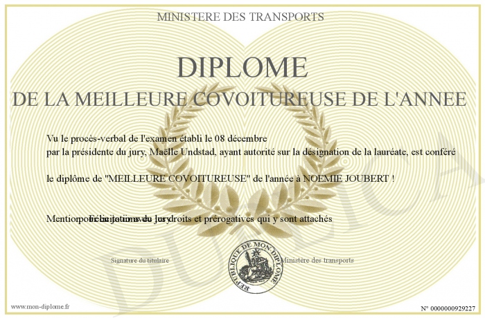 Envoyez par email votre Diplôme de la meilleure covoitureuse de l'année personalisé