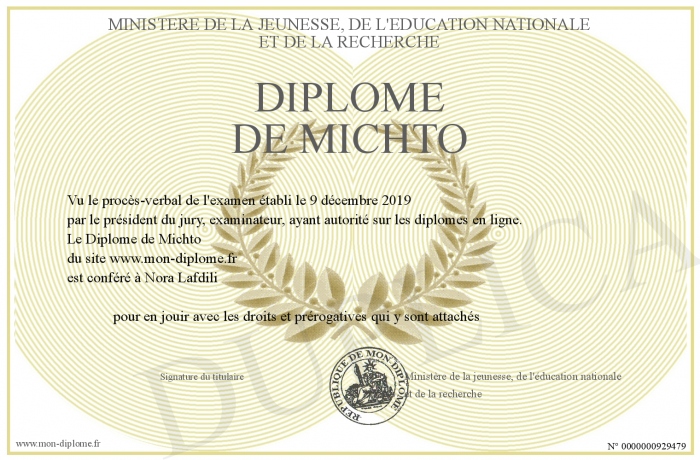 Envoyez par email votre Diplôme de Michto personalisé