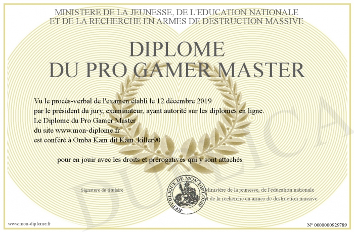 Envoyez par email votre Diplôme du Pro Gamer Master personalisé