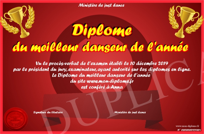 Envoyez par email votre Diplôme du meilleur danseur de l'année personalisé