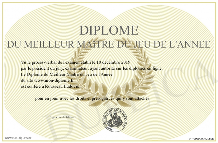 Envoyez par email votre Diplôme du Meilleur Maître du Jeu de l'Année personalisé