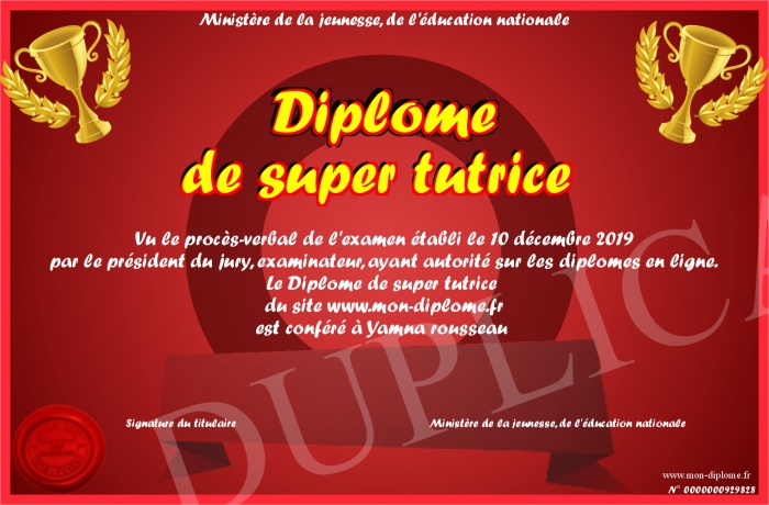 Envoyez par email votre Diplôme de super tutrice personalisé