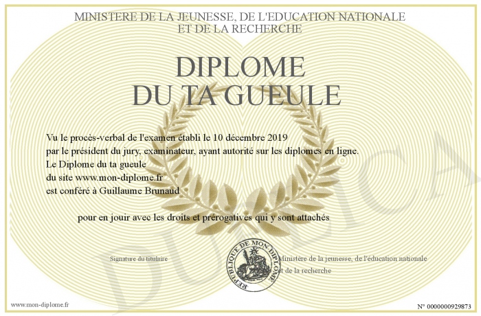 Envoyez par email votre Diplôme du ta gueule personalisé