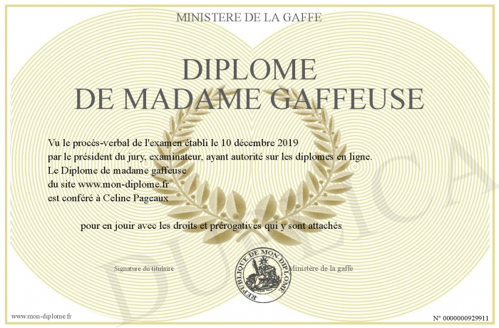 Envoyez par email votre Diplôme de madame gaffeuse personalisé