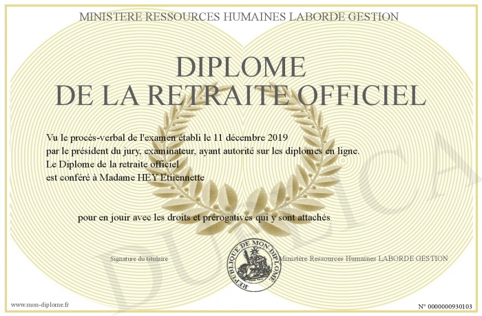 Envoyez par email votre Diplome de la retraite officiel personalisé