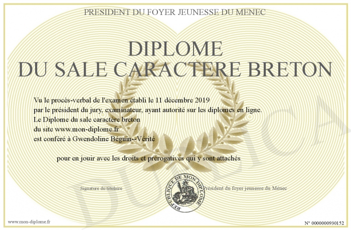 Envoyez par email votre Diplôme du sale caractère breton personalisé