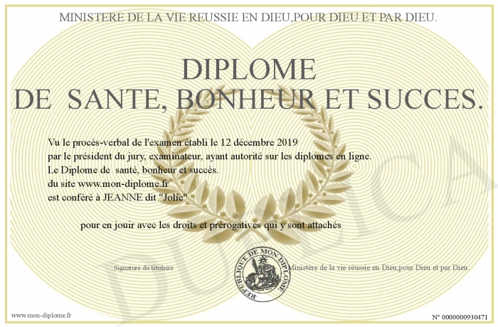 Envoyez par email votre Diplôme de santé, bonheur et succès. personalisé