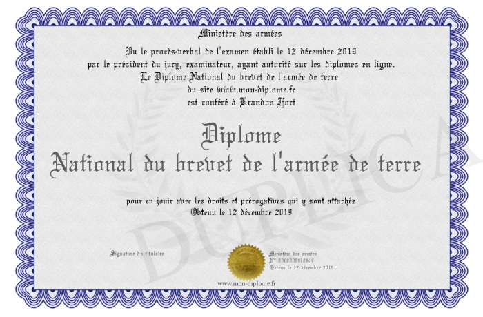 Envoyez par email votre Diplôme National du brevet de l'armée de terre personalisé