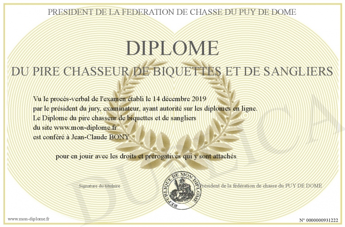 Envoyez par email votre Diplôme du pire chasseur de biquettes et de sangliers personalisé