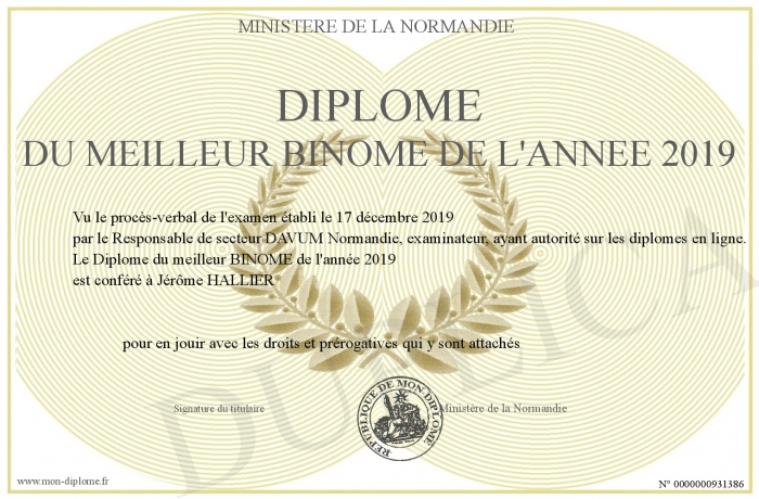 Envoyez par email votre Diplôme du meilleur BINOME de l'année 2019 personalisé