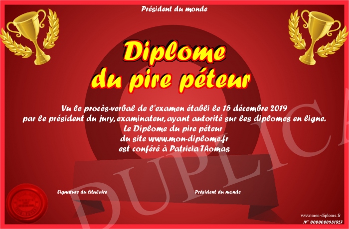 Envoyez par email votre Diplôme du pire péteur personalisé