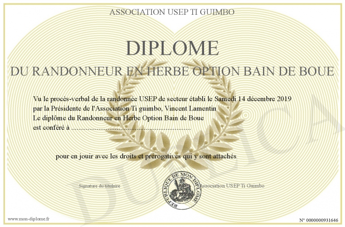 Envoyez par email votre Diplôme du Randonneur en Herbe Option Bain de Boue personalisé