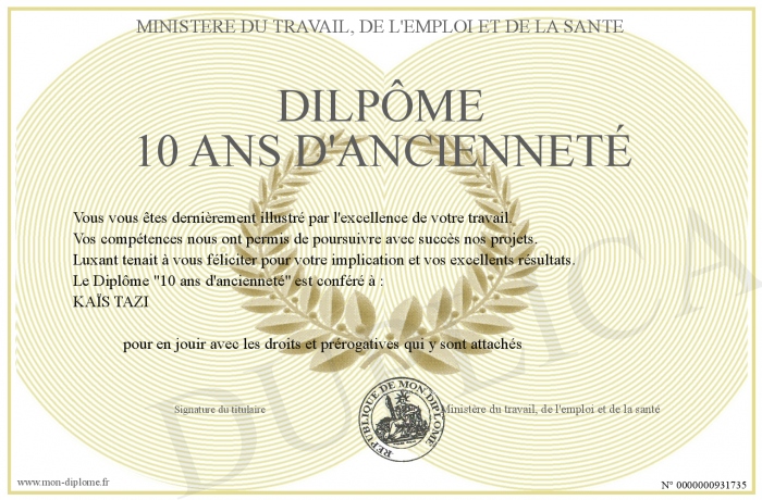 Envoyez par email votre DILPÔME 10 ANS D'ANCIENNETÉ personalisé