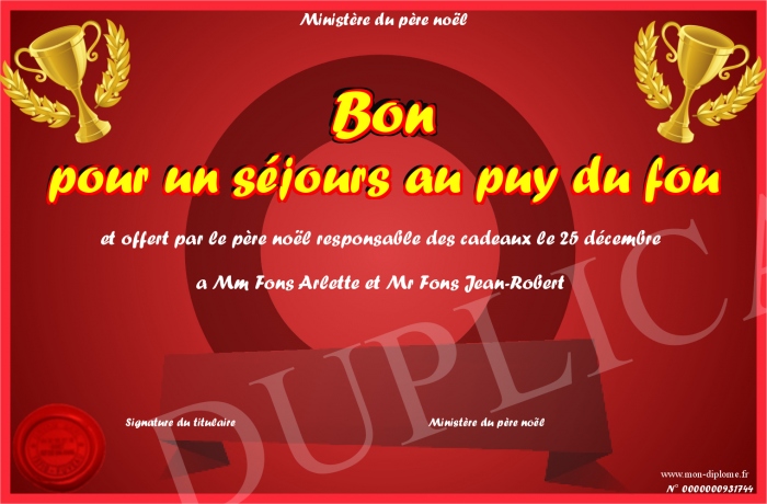 Envoyez par email votre Bon pour un séjours au puy du fou personalisé