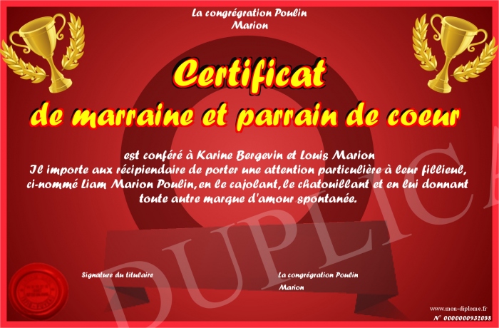 Envoyez par email votre Certificat de marraine et parrain de coeur personalisé