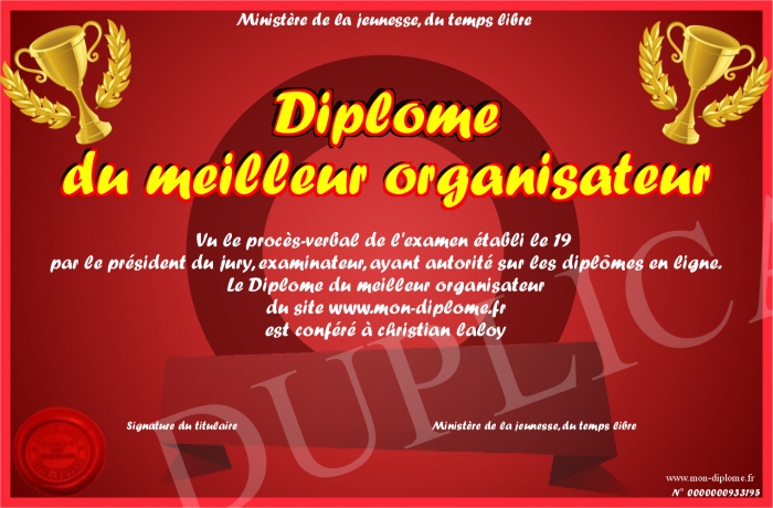 Envoyez par email votre Diplôme du meilleur organisateur personalisé