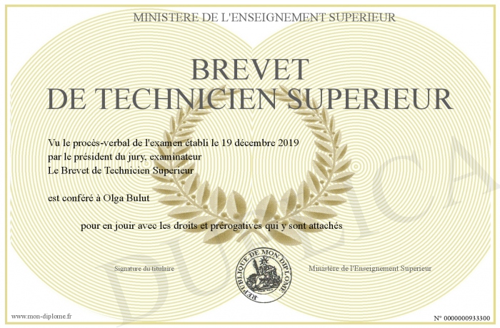 Envoyez par email votre Brevet de Technicien Superieur personalisé