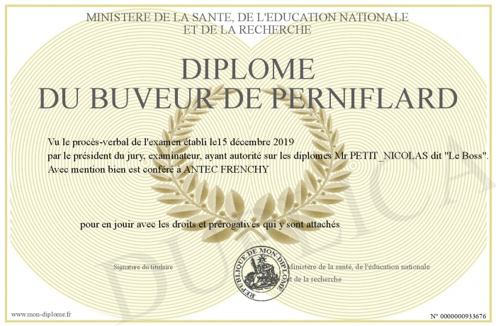 Envoyez par email votre DIPLOME DU BUVEUR DE PERNIFLARD personalisé