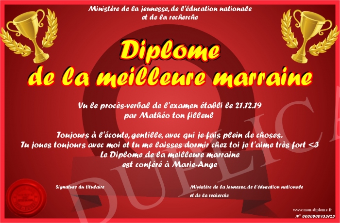 Envoyez par email votre Diplôme de la meilleure marraine personalisé