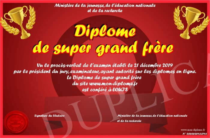 Envoyez par email votre Diplôme de super grand frère personalisé