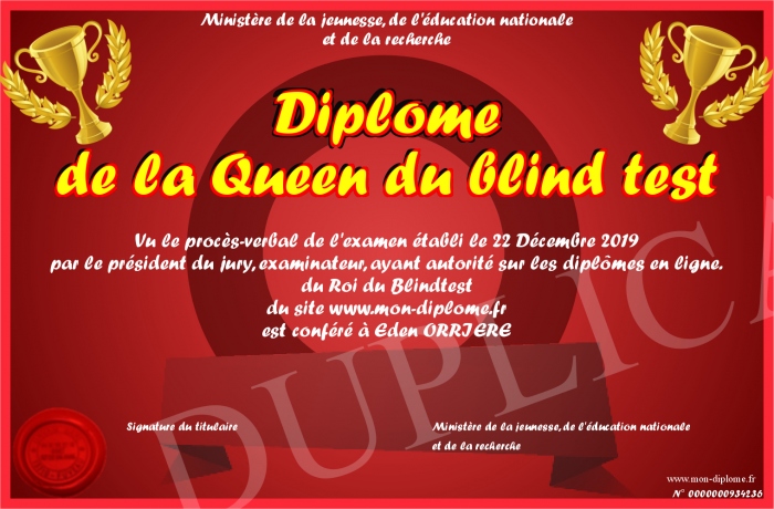 Envoyez par email votre Diplôme de la Queen du blind test personalisé