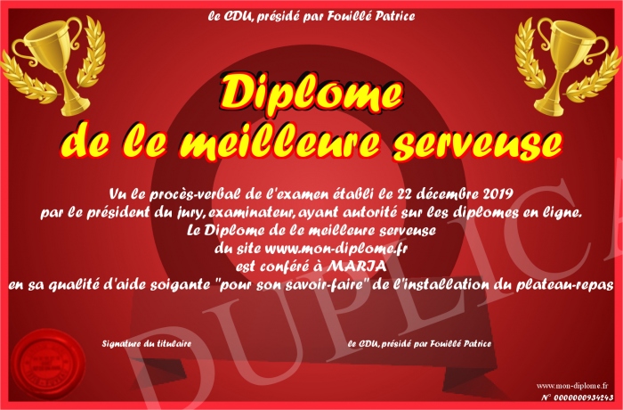 Envoyez par email votre Diplôme de le meilleure serveuse personalisé
