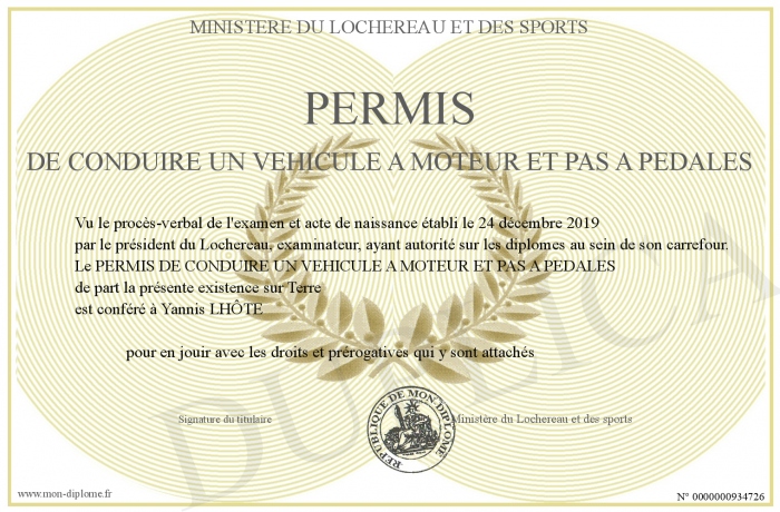 Envoyez par email votre PERMIS DE CONDUIRE UN VEHICULE A MOTEUR ET PAS A PEDALES personalisé