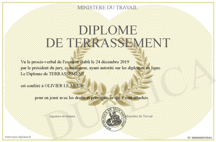 Envoyez par email votre Diplôme de TERRASSEMENT personalisé